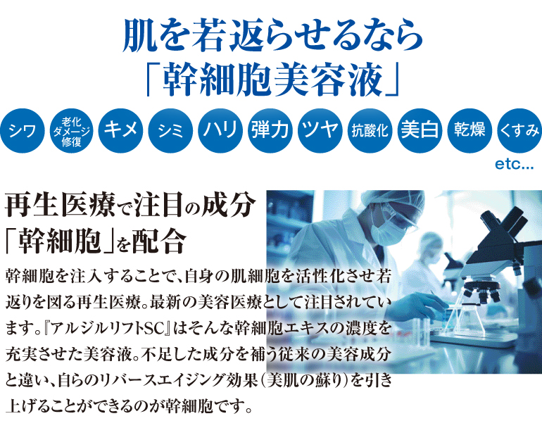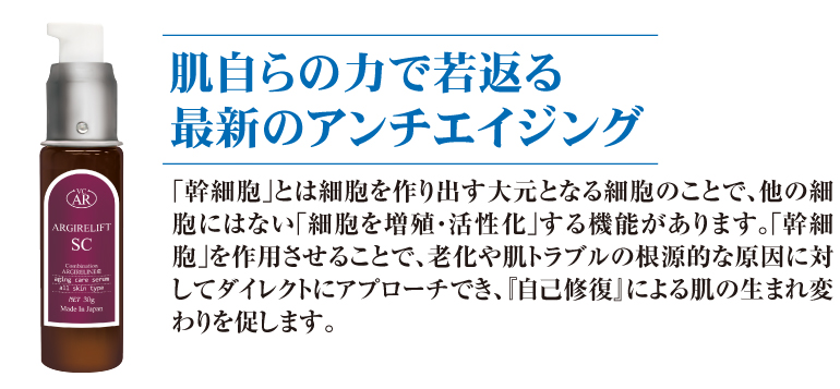 アルジルリフトSCは、塗るボトックス「アルジルリン」と「幹細胞エキス」を配合したシワ専用美容液です。幹細胞は自らのリバースエイジング効果(美肌の蘇り)を引き上げて肌の生まれ変わりを促します。